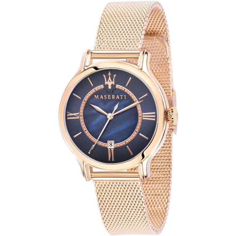 Marke: Maserati; Kollektion: Epoca; Artikelcode: R8853118513; Produkttyp: Armbanduhr; Geschlecht: Frau; Funktionen: Zeit, Datum; Uhrwerk / Mechanismus: Quarz TMI VJ32 (Batterie); Gehäuseform: Runder; Gehäusematerial: Edelstahl; Gehäusefarbe: Roségold; Gehäusedurchmesser Ø: 34 mm; Zifferblatt: Analog; Zifferblattfarbe: Blau; Bandmaterial: Edelstahl; Armbandfarbe: Roségold; Wasserbeständigkeit: 100 Meter / 10 bar.