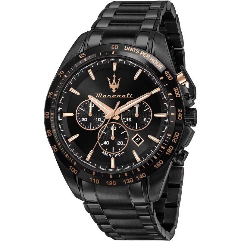 Marke: Maserati; Kollektion: Traguardo; Artikelcode: R8873612048; Produkttyp: Armbanduhr; Geschlecht: Mann; Funktionen > Multifunktions: Zeit, Datum, Chronograph, 24 Stunden; Uhrwerk / Mechanismus: Quarz MIYOTA JS25 (Batterie); Gehäuseform: Runder; Gehäusematerial: Edelstahl; Gehäusefarbe: Schwarz; Gehäusedurchmesser Ø: 45 mm; Zifferblatt: Analog; Zifferblattfarbe: Schwarz; Bandmaterial: Edelstahl; Armbandfarbe: Schwarz; Wasserbeständigkeit: 100 Meter / 10 bar.