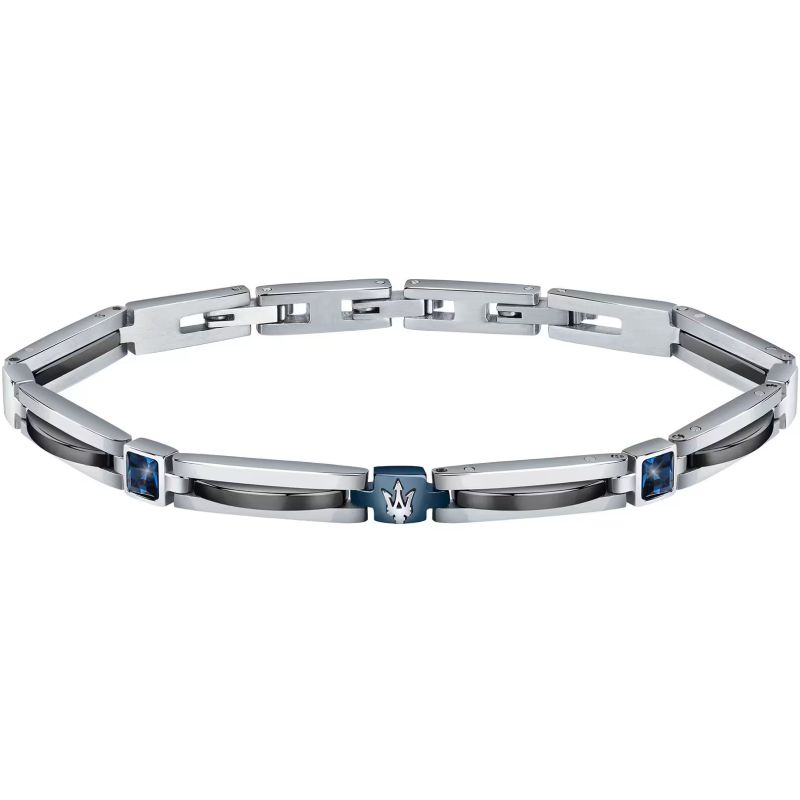 Brand: Maserati; Collection: Maserati Jewels; Article Code: JM223ATZ20; Type of product: Bracelet; Gender: Man; Material: Hypoallergenic steel, Black ceramic, Blue crystals; Color: Silver, Black, Blue; Size / Measure: 21 cm.