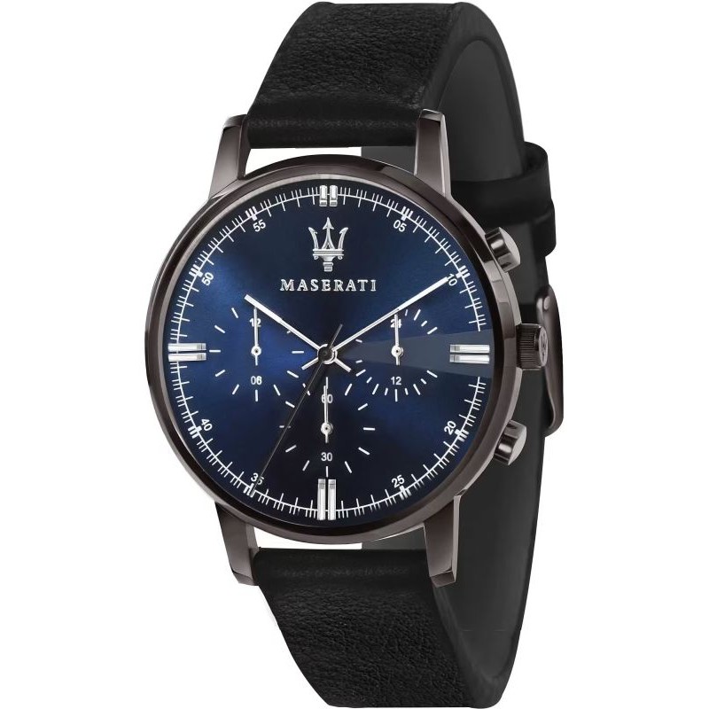 Brand: Maserati; Collection: Eleganza; Article Code: R8871630002; Type of product: Wristwatch; Gender: Man; Functions > Multifunction: Time, Chronograph, 24 hours; Type of Movement / Mechanism: Quartz TMI VD34 (Battery); Case Shape: Round; Case Material: Stainless Steel; Case Color: Dark grey; Case Diameter Ø: 42 mm; Type of Dial: Analog; Color of the Dial: Blue; Strap Material: Leather; Strap Color: Black; Water Resistance: 50 meters / 5 bar.