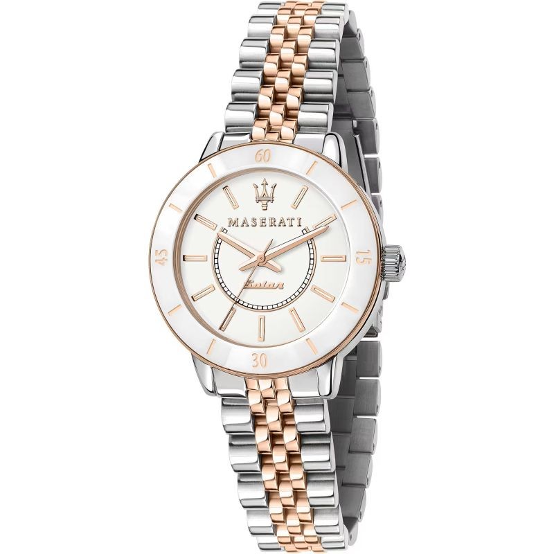 Marque: Maserati; Collection: Successo; Code de l'Article: R8853145504; Type de produit: Montre-bracelet; Genre: Femme; Fonctions: Seul le Temps; Type de Mouvement / Mécanisme: Solaire SEIKO AS01; Forme du Boîtier: Ronde; Matériau du Boîtier: Acier Inoxydable, Céramique; Couleur du Boîtier: Acier et Or Rose; Diamètre du Boîtier Ø: 32 mm; Type de Cadran: Analogique; Couleur du Cadran: Blanc; Matériau de la Sangle: Acier Inoxydable; Couleur de la Sangle: Acier et Or Rose; Résistance à l'eau: 50 mètres / 5 bar.