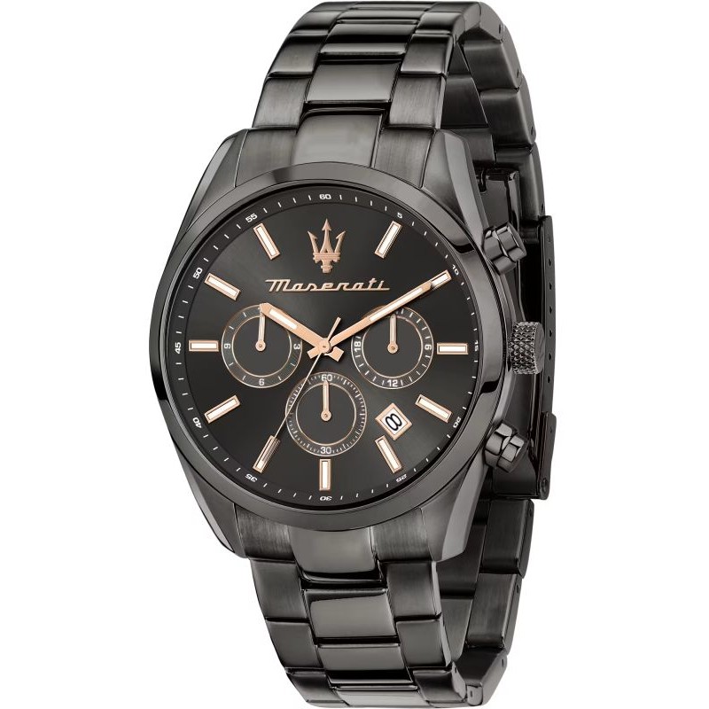 Marque: Maserati; Collection: Attrazione; Code de l'Article: R8853151001; Type de produit: Montre-bracelet; Genre: Homme; Fonctions: Multifonction: Heure, Date, Chronographe, 24 heures; Type de Mouvement / Mécanisme: Quartz SEIKO VD33 (Batterie); Forme du Boîtier: Ronde; Matériau du Boîtier: Acier Inoxydable; Couleur du Boîtier: Gris foncé; Diamètre du Boîtier Ø: 43 mm; Type de Cadran: Analogique; Couleur du Cadran: Noir; Matériau de la Sangle: Acier Inoxydable; Couleur de la Sangle: Gris foncé; Résistance à l'eau: 50 mètres / 5 bar.