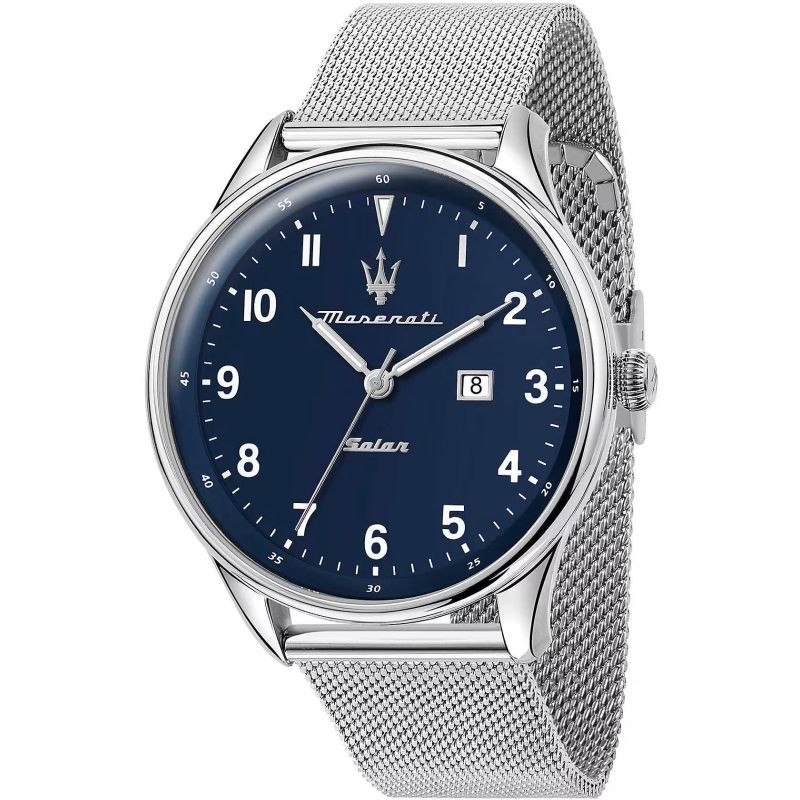 Brand: Maserati; Collection: Tradizione; Article Code: R8851146002; Type of product: Wristwatch; Gender: Man; Functions: Time, Date; Type of Movement / Mechanism: Solar SEIKO AS32; Case Shape: Round; Case Material: Stainless Steel; Case Color: Steel; Case Diameter Ø: 45 mm; Type of Dial: Analog; Color of the Dial: Blue; Strap Material: Stainless Steel; Strap Color: Steel; Water Resistance: 100 meters / 10 bar.